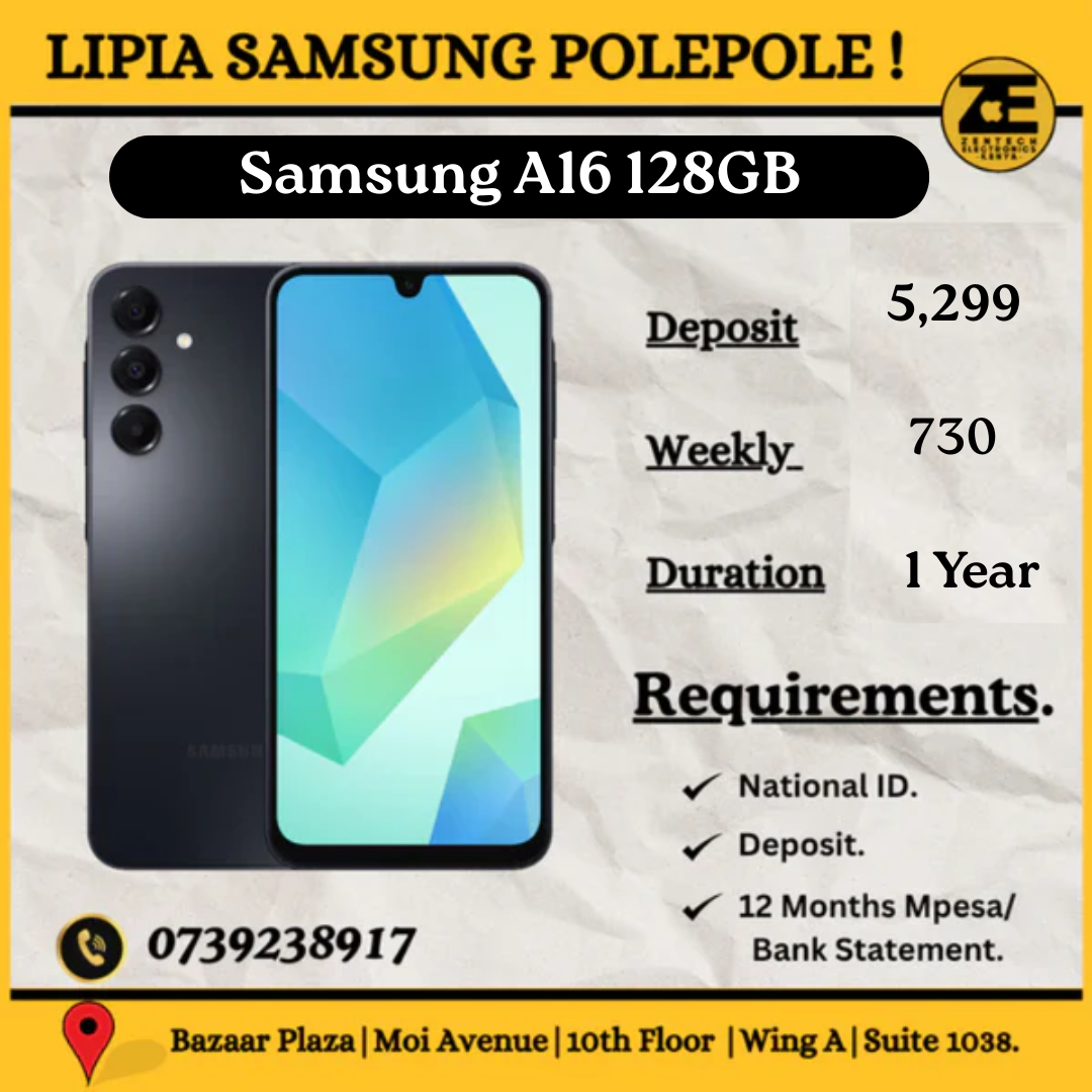 Lipa Polepole Plan Flexible · Fast · Friendly Storage 6GB RAM 128GB Deposit KES 5,299 Weekly Payment KES 730 Duration 1 Year Samsung Galaxy A16 –...