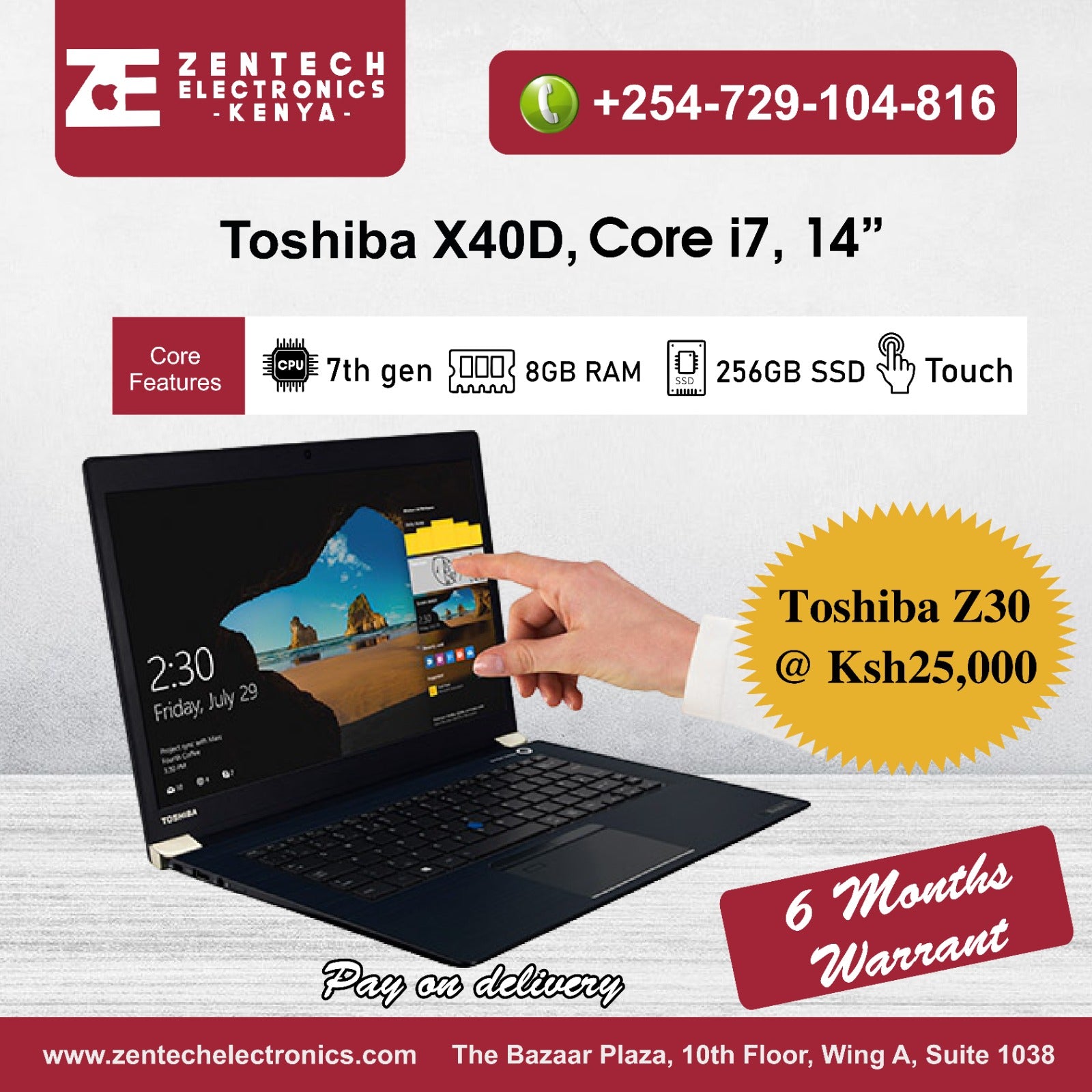 Regular price KSh28,000.00Sale price KSh28,000.00 Regular priceUnit price perKSh30,800.00Sale Sold outSpecifications \nToshiba Portégé Z30-D Core i7,8GB RAM,128GB SSD \n \nProcessor: Intel Core i5,4th Generation \n \nRAM: 8 GB \n \nStorage:128GB SSD \n \nScreen Size:13.3inches \n \n...