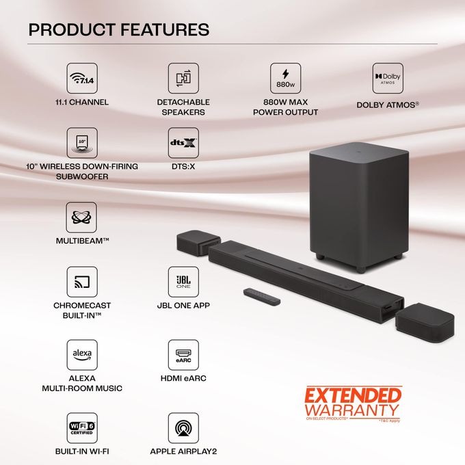 Regular price KSh100,000.00Sale price KSh100,000.00 Regular priceUnit price perKSh128,700.00Sale Sold outJBL Bar 1000 7.1.4-Channel Soundbar With Detachable Surround Speakers And Wireless SubwooferKey Features: True Dolby Atmos, DTS:X, and MultiBeam Surround Sound: Immerse yourself in theater-quality 3D...