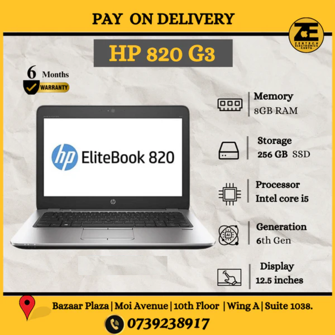 Regular price From KSh21,500.00Sale price From KSh21,500.00 Regular priceUnit price perKSh35,200.00Sale Sold outHP EliteBook 820 G3 Specifications Processor Options Intel Core i5-6200U or i5-6300U (6th Gen) Also available with Core i7-6500U or i7-6600U Graphics Integrated Intel HD Graphics...